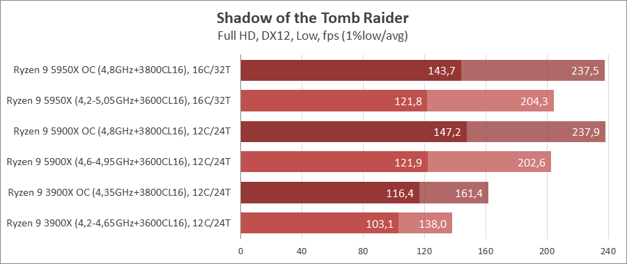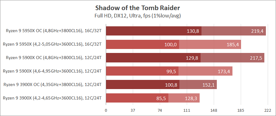 Shadow of the Tomb Raider — именно та игра, ради которой любой Ryzen 5000 можно купить не глядя! А если серьезно, то Vermeer тут демонстрирует почти 1,5-кратный рост производительности, даже переход к максимальной графике оставляет разрыв в 35%. Разгон его еще больше увеличивает.