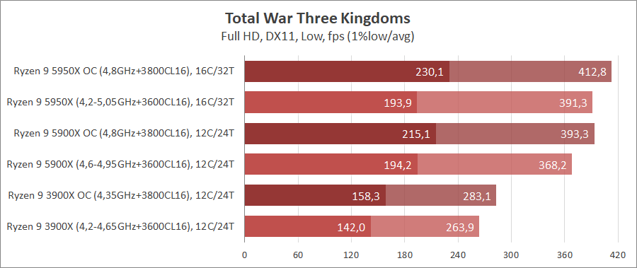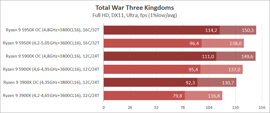 Стратегия Total War Three Kingdoms отличается особой любовью к решениям синего лагеря, но глядя как представители Zen 3 прибавили в ней около 40–50%, будет интересно взглянуть на противостояние новинок с тем же Core i9-10900K, даже в разгоне. Тюнинг Ryzen 9 3900X хоть и повысил производительность на 15–20 fps, до своих приемников он так и не дотянулся.