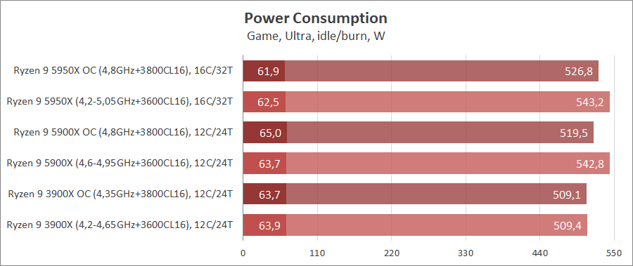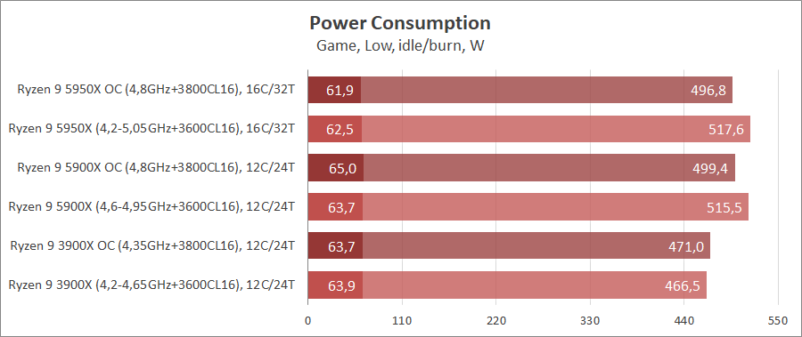 Как видим, системы с представителями архитектуры Zen 3 в номинале потребляют больше, чем с предшественником. Учитывая, что Vermeer в играх ускоряются значительней, чем Ryzen 9 3900X, это и не удивительно. С разгоном потребление даже ниже, что объясняется корректировкой VID. Для Matisse напряжение 1,35 В несильно ушло от номинала при такой нагрузке, поэтому особой экономии ожидать не стоит.