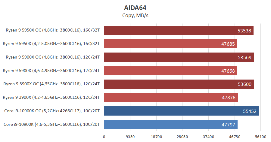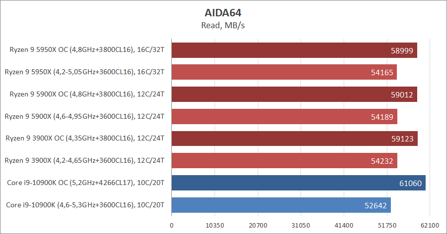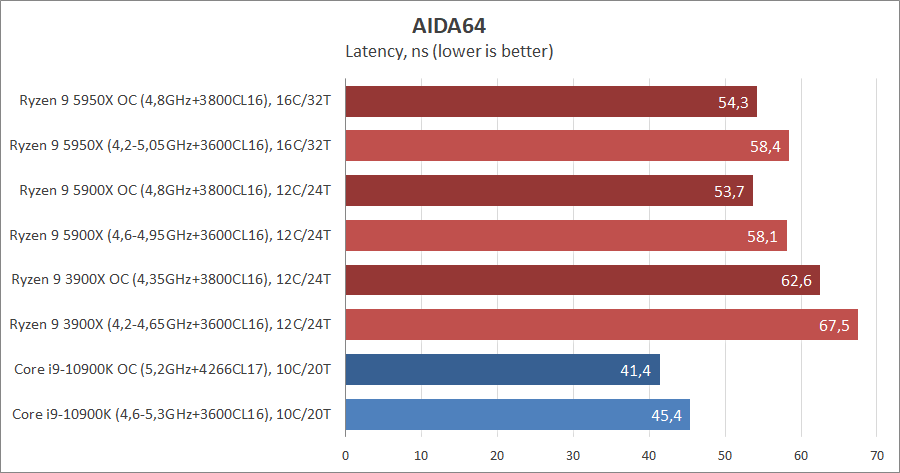 Удивительно, но Core i9-10900K в тесте подсистемы памяти смог себя показать лишь при проверке латентности и после разгона ОЗУ до 4266 МГц. В остальных случаях он либо равен, либо немного отстает. Vermeer неплохо приблизился к конкуренту по времени доступа.