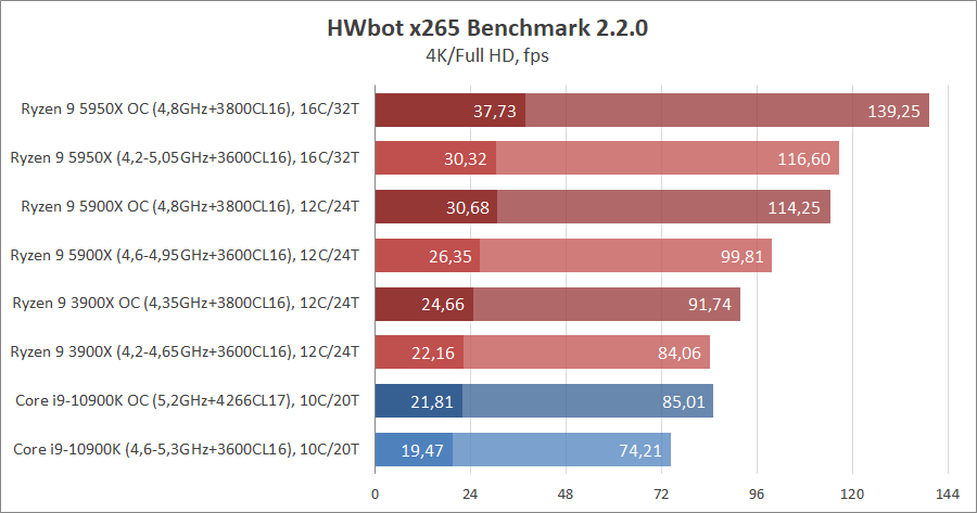 При работе с видео Comet Lake-S опять потребляет больше всех, при разгоне даже обходит по этому показателю Ryzen 9 5950X, хотя демонстрирует самый худший результат.