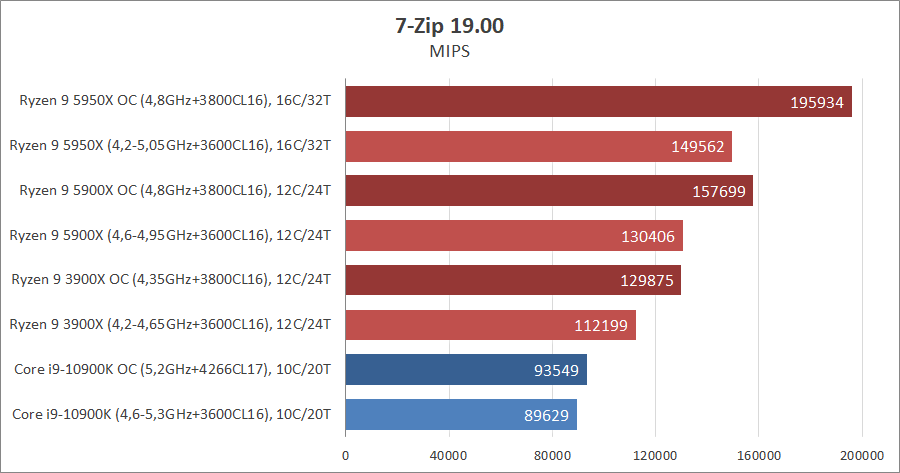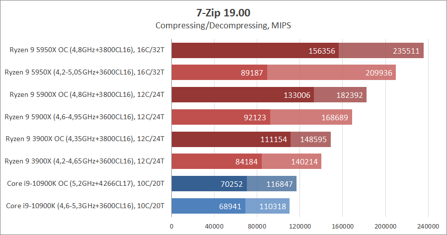 Архивирование опять же лучше проходит на решениях AMD. Интересно, что результат по сжатию данных у Ryzen 9 5950X на несколько процентов хуже, чем у младшей модели. Скорее всего, тут влияет частота процессора, а у старшего Vermeer она ниже при многопоточной обработке.