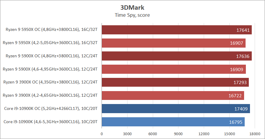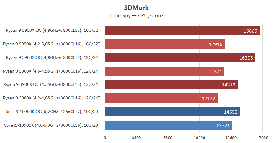 В 3DMark с настройками по умолчанию Core i9-10900K оказался производительней, но разгон добавил уверенности Ryzen 9 3900X и вывел в лидеры оба Vermeer.
