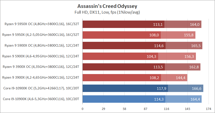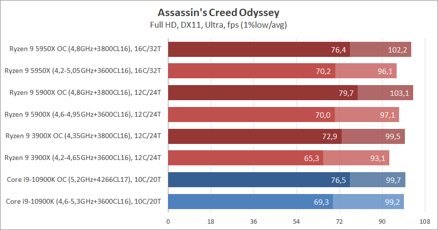Assassins Creed Odyssey благоволит Intel, несмотря на лого AMD при старте игры, но Ryzen 5000 неплохо подтянули производительность и отставание 2–3 кадра по среднему fps пользователь вряд ли заметит, а с одинаковыми показателями редких событий и подавно. Разгон дает неплохую прибавку красным продуктам.