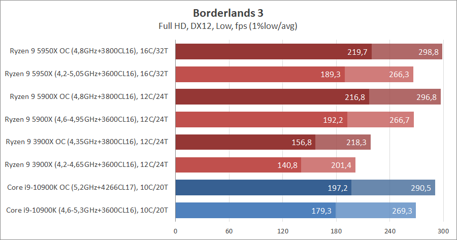 В Borderlands 3 фактически паритет, но с переходом на более качественную графику у Intel чуть выше результат по среднему fps, особенно, при разгоне.