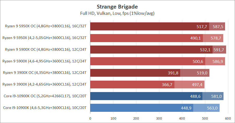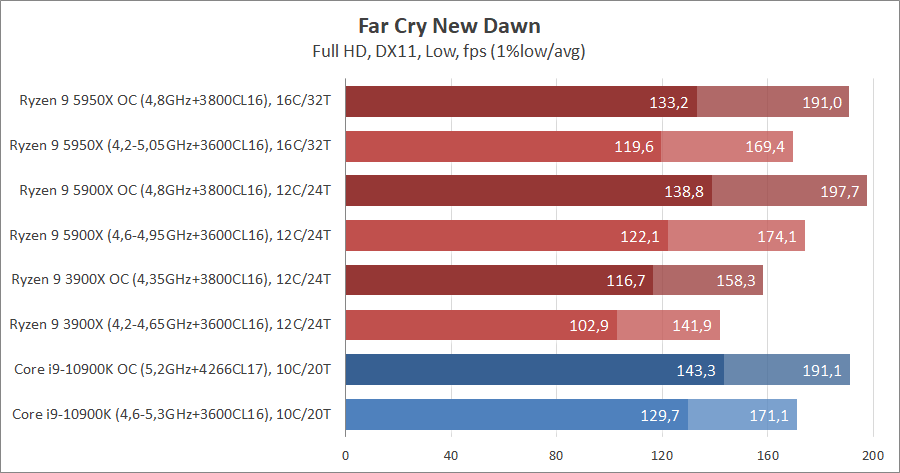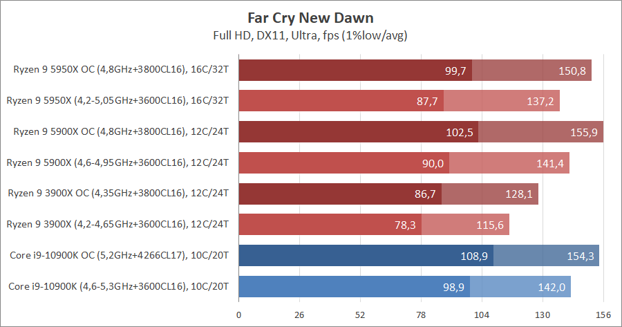 Ryzen 9 5950X в Far Cry New Dawn оказался чуть хуже своего младшего собрата и конкурента, тогда как Ryzen 9 5900X производительней обоих оппонентов, но качественная графика уровняла шансы относительно синего решения. Показатели редких событий на Intel выглядят немного привлекательней.
