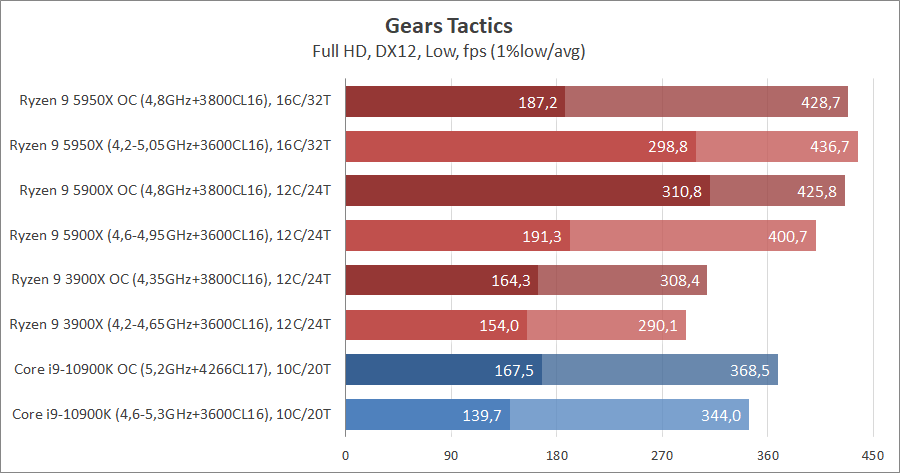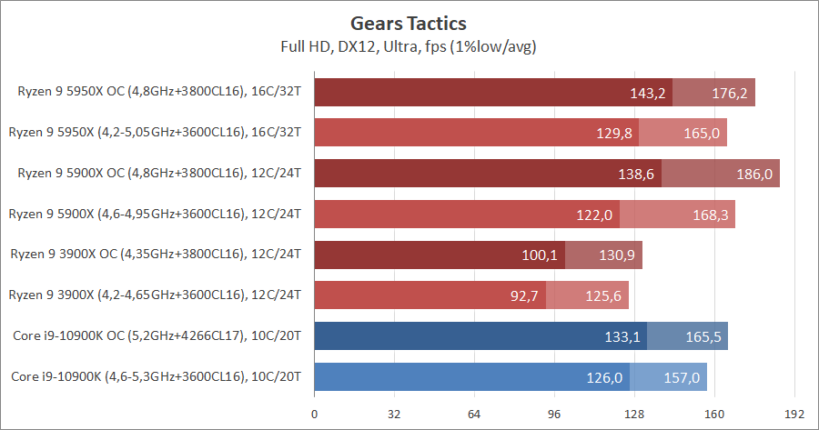 Недавно вышедшая Gears Tactics хоть и неоднозначна в показателях встроенного бенчмарка, но даже так на Vermeer она лучше себя проявляет, чем на Core i9-10900K. Последнему необходим разгон, чтобы процессор сравнялся с оппонентами.