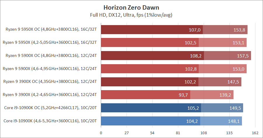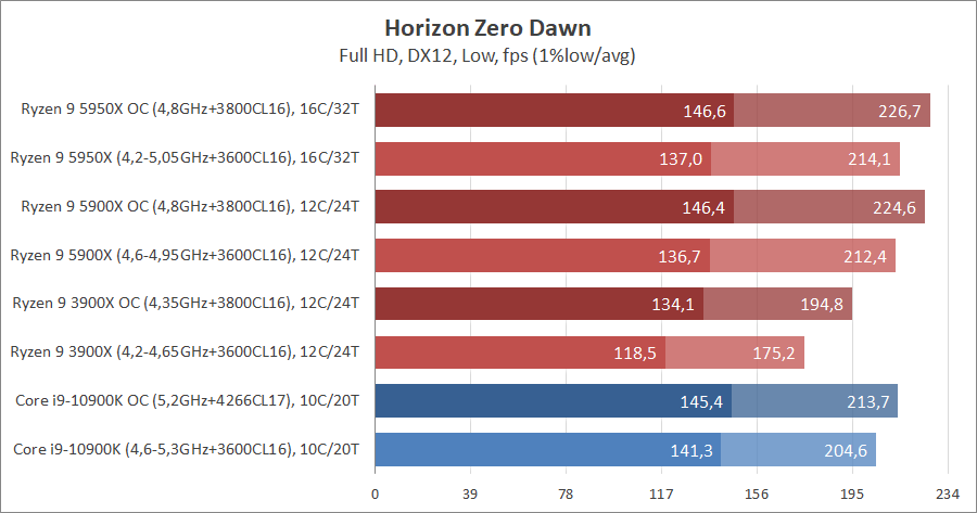 Еще одна новинка в лице Horizon Zero Dawn. Игра по среднему fps немного лучше чувствует себя на платформе AMD, тогда как просадки по 1% low менее значимые на Intel. С разгоном Vermeer становятся чуть производительней, а Ryzen 9 5900X вообще выходит в лидеры при максимальном качестве графики. Matisse, как всегда, где-то там на фоне.