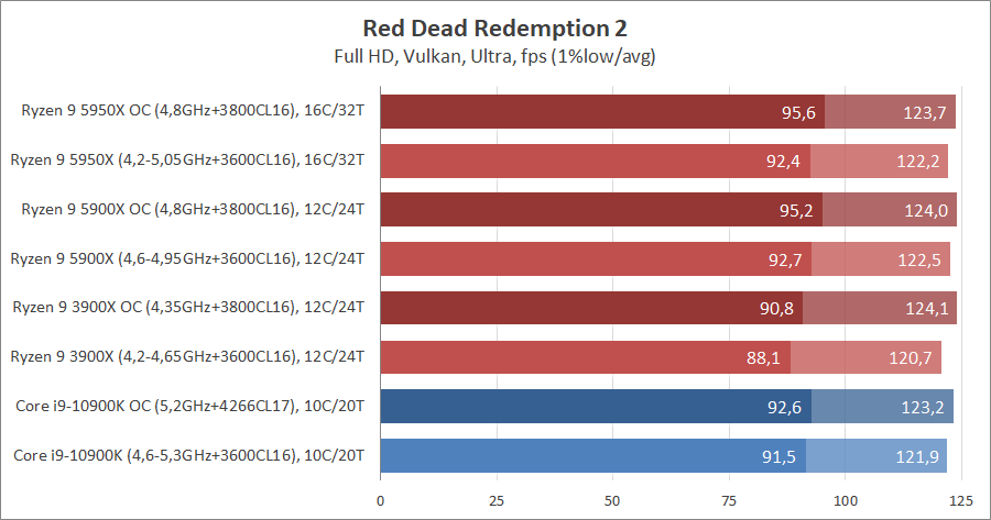 Забегая наперед отмечу, что складывается некое впечатление оптимизации со стороны AMD своих новых процессоров в определенных играх, где решения Intel были всегда сильнее. Или это просто показалось, или команда Лизы Су действительно взялась за голову и провела грандиозную работу по обновлению архитектуры Zen. Итак, в Red Dead Redemption 2 новинки попросту растоптали Core i9-10900K, которому не помог даже разгон. Правда, с ультра-качеством все уперлось в видеокарту и уже Ryzen 9 3900X тоже выглядит неплохо.