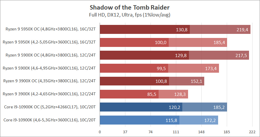 В Shadow of the Tomb Raider еще один прорыв производительности, но по среднему fps, тогда как по редким событиям лучше к Intel. Разгон позволяет Ryzen 5000 перейти рубеж в 200 кадров при качественной графике, что для конкурента попросту недостижимо.