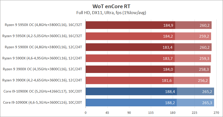 В WoT enCore RT как всегда мощные процессоры, да еще и с разгоном, демонстрируют худший результат, но с качеством «Ультра» все приходит в норму. Хотя для Intel игра все же накинула пять кадров, иначе как же так?