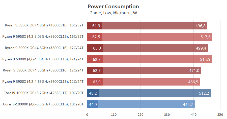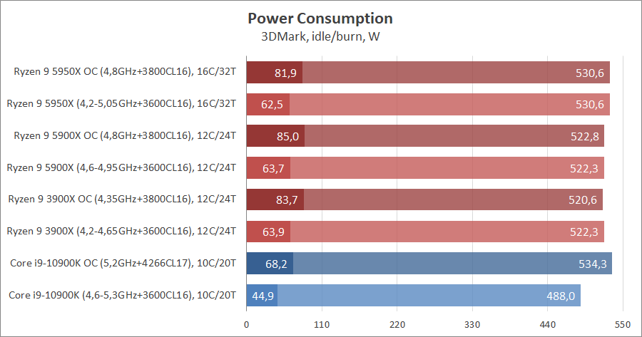 В однопоточной нагрузке видно, что процессоры AMD потребляют больше энергии, чем Intel, но при задействовании всех ядер картина меняется и Core i9-10900K уже не так привлекателен. С разгоном все только усугубляется, тем более при пересчете «производительность на ватт». Не забываем, что в таком режиме помпа кастомного водяного охлаждения вносит свой вклад в общее энергопотребление.