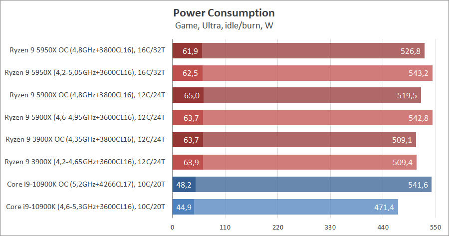 По типу прошлого материала с игровым тестированием показатели энергопотребления приведены к общему виду, т.е. при разгоне попросту отняты 20 ватт. Система с процессором Intel в стоке экономичнее платформы AM4, тем более с Ryzen 5000, но разгон Core i9-10900K приводит к повышенному потреблению энергии. Корректировка напряжения Vermeer на повышенных частотах позволила снизить этот показатель, а ведь можно еще и поиграться с offset в стоке.