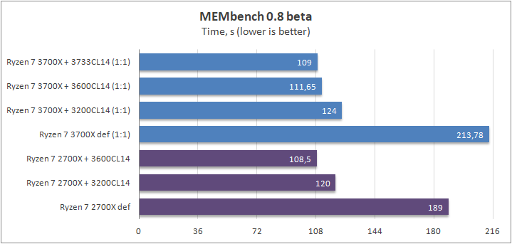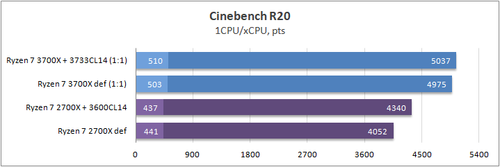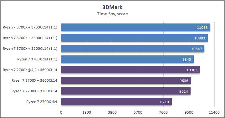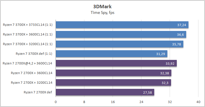 Разгон ОЗУ для Ryzen 7 3700Х позволил получить дополнительных 10% производительности. Разница между дефолтными состояниями процессора составила около 20%.