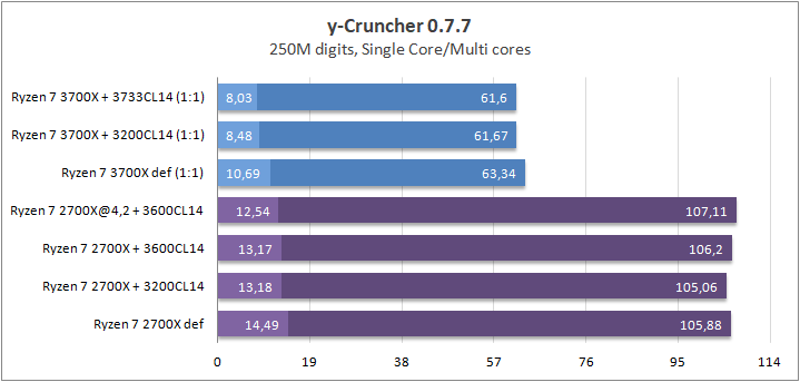 Еще одной интересной особенностью этого теста является реакция на разгон Infinity Fabric (FCLK). Из-за снижения задержек между ядрами и комплексами растет многоядерная утилизация, от чего меняется и время вычисления числа Pi (ну или любой другой константы). Удивительно, но для процессоров поколения Matisse я получил на 33% меньшее время вычисления константы, используя разгон ОЗУ. В случае прошлого поколения максимальная разница составляла всего лишь 15%. Подводя итог данного теста, хочу отметить, что разгон ОЗУ может очень сильно повлиять на скорость выполнения оптимизированного многопоточного кода.