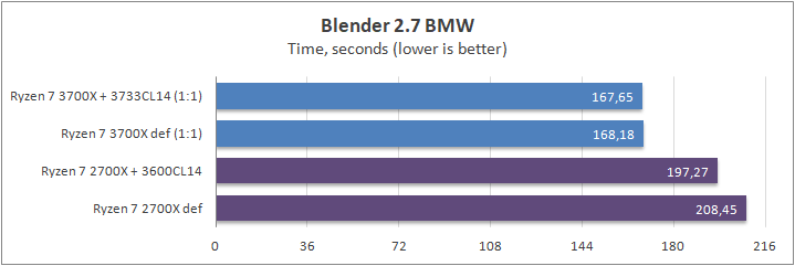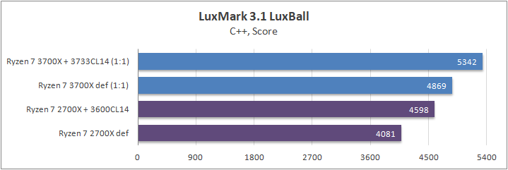 Еще один рендер-пакет. Он продемонстрировал куда большую разницу, нежели его предыдущие сородичи. Максимальный отрыв Zen 2 от Zen+ составил 36%. Разгон ОЗУ на результаты не повлиял.