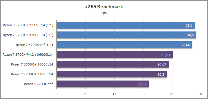 x265 — это открытая реализация нового стандарта кодирования видео H.265 (или по-другому High Efficiency Video Coding (HEVC)). Стандарт H.265 является логическим продолжением H.264 и характеризуется более эффективными алгоритмами сжатия. Разница достигает 46% между Ryzen 7 2700Х и Ryzen 7 3700Х в стоке. Разгон ОЗУ повилял слабо в случае Ryzen 7 3700Х, лишь несколько дополнительных процентов производительности.