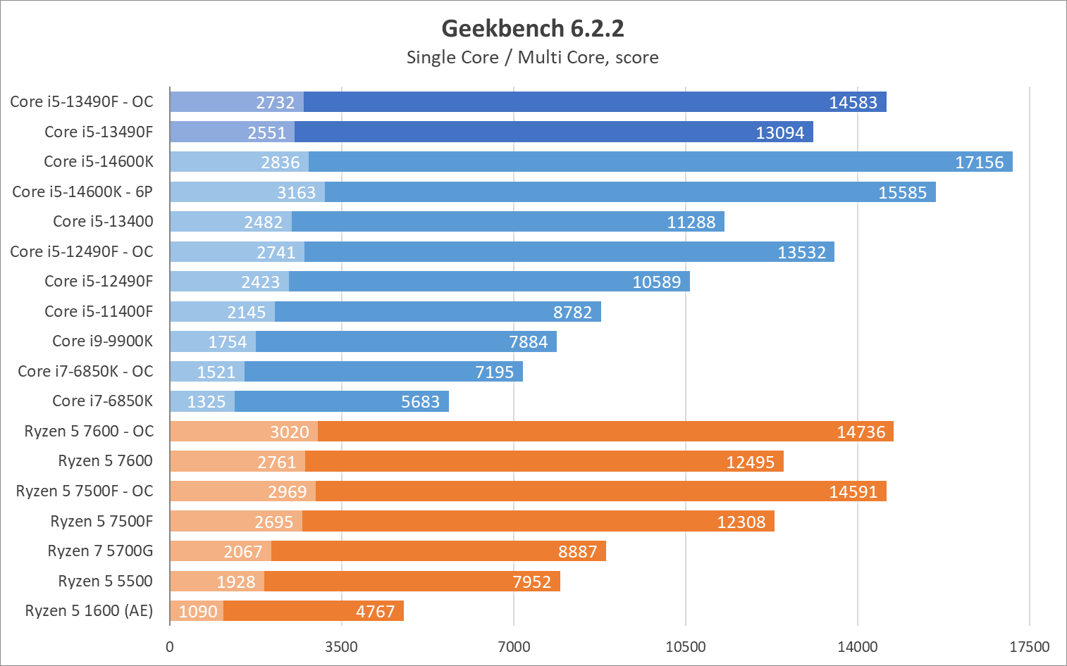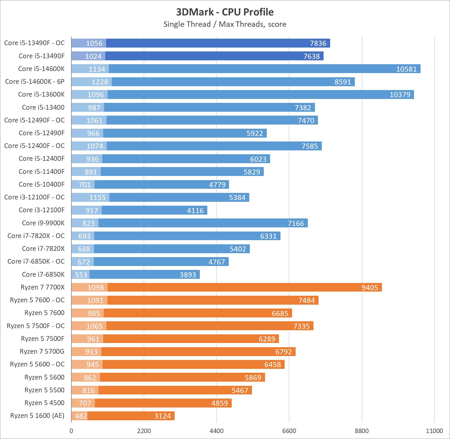 Если учитывать производительность именно в комплексе P+E ядер — процессор выступает на уровне Ryzen 5 7500F и Ryzen 5 7600, однако последние стандартные 6-ядерные процессоры, а не 10-ядерные!