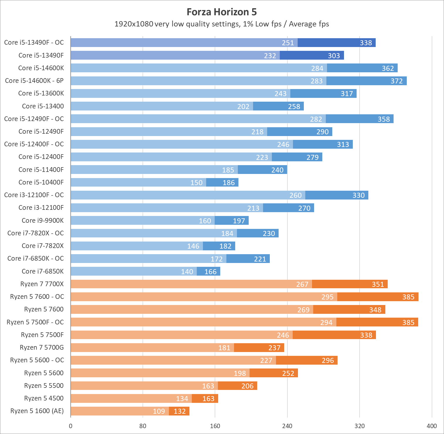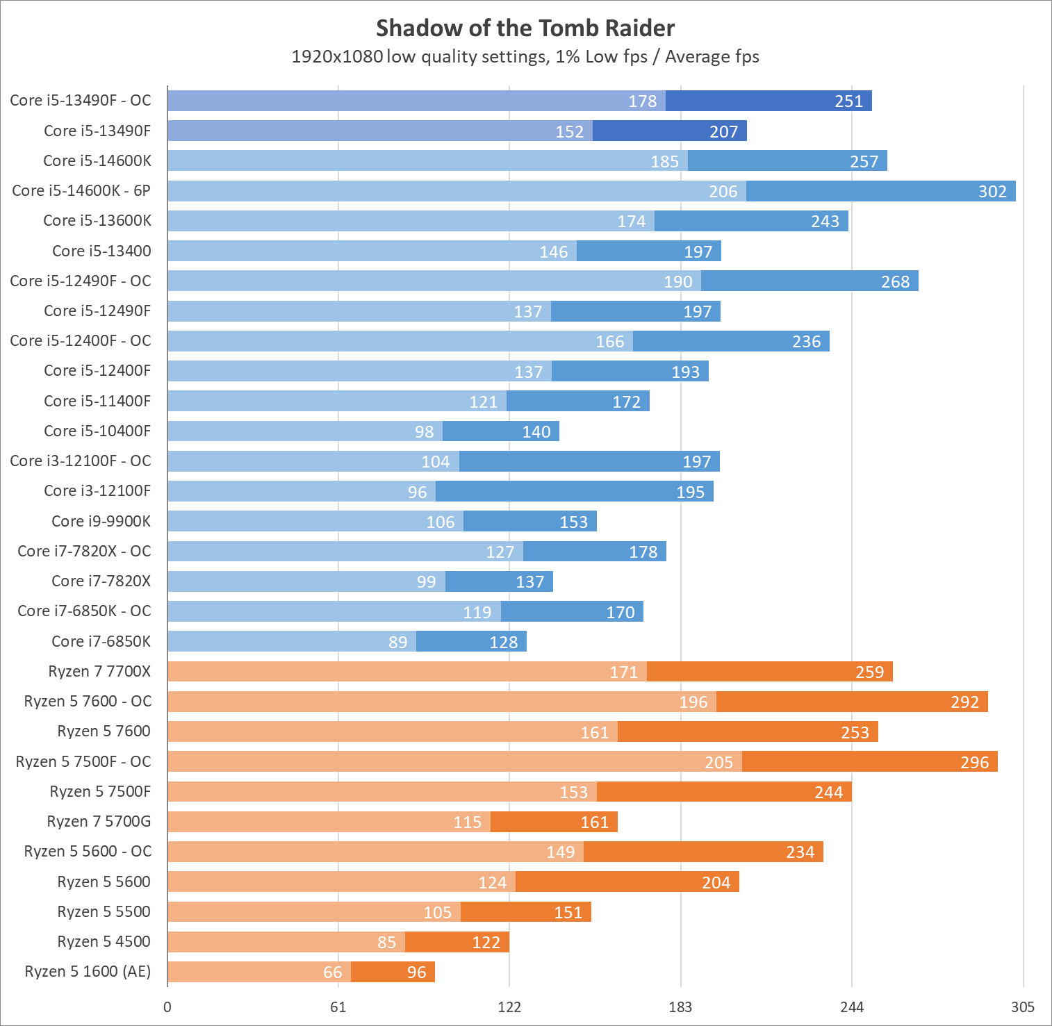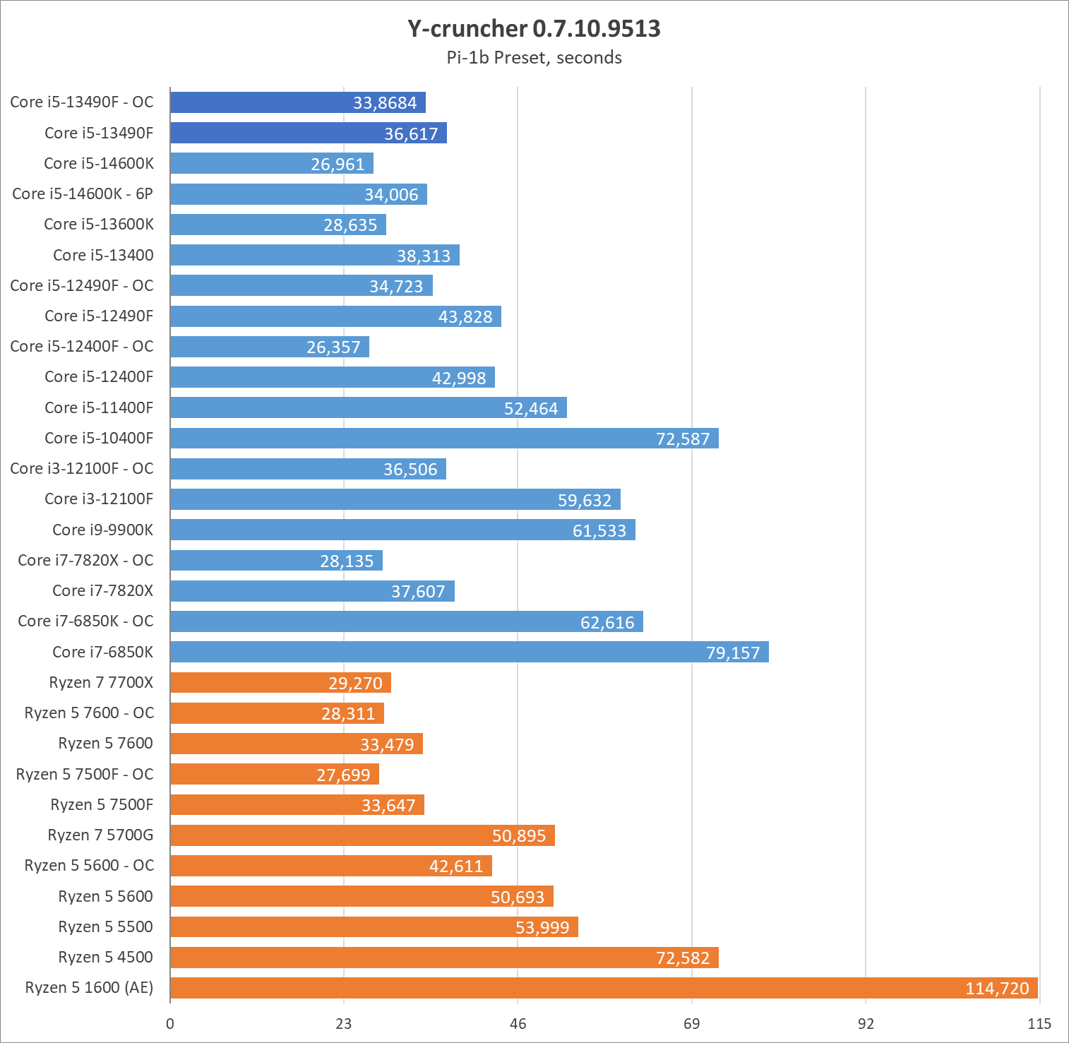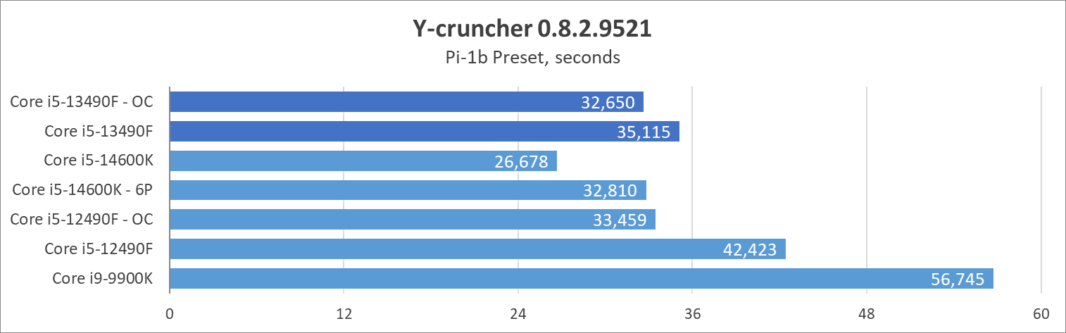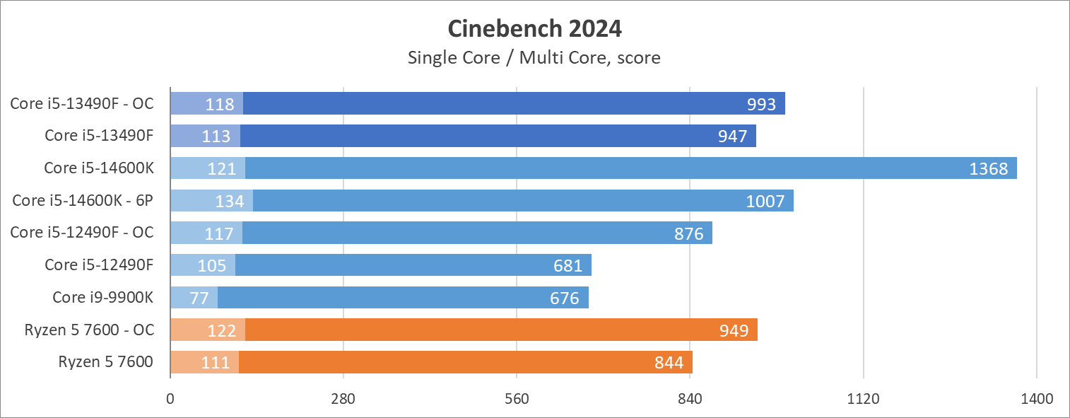 Если также учесть какие-никакие возможности разгона, то систему во главе с главным героем обзора можно ускорить еще на 10% выше номинала в комплексе по всем ядрам в бенчмарках и играх. В этом режиме он уже дает отпор конкурентам красного лагеря на стандартных настройках, но догнать разблокированные Core i5-13600K и i5-14600K невозможно. Кроме того, разогнанные Ryzen не оставят герою обзора никакого шанса.