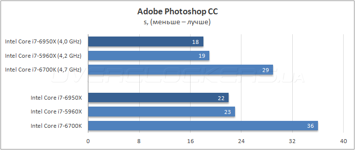 Работа с двухмерными объектами также не главный конек массового решения, тогда как новичок в Photoshop с задачей справляется лучше, хоть и не на много быстрее, чем Core i7-5960X.