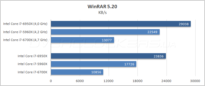 Аналогичная ситуация сложилась и в программе архивирования WinRAR. Тут Core i7-6950X просто недостижим даже в своем номинальном режиме работы, опередив своих оппонентов на 30–50%.