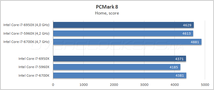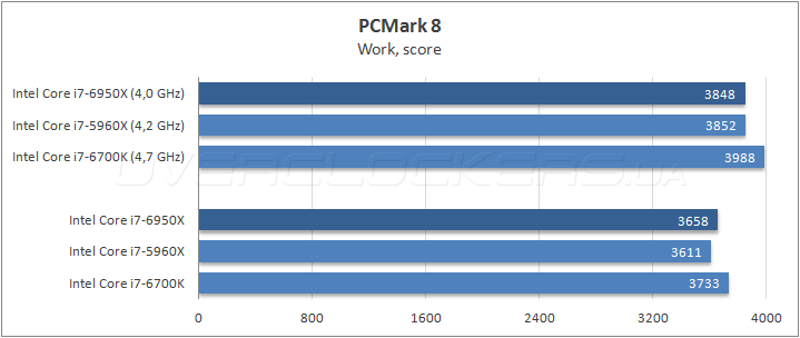 Забавная ситуация оказалась в комплексном пакете PCMark 8. Процессор Core i7-6950X будучи производительнее своего предшественника в большинстве случаев оказался медленнее более доступной модели, которая для домашнего пользователя становится самым оптимальным вариантом.