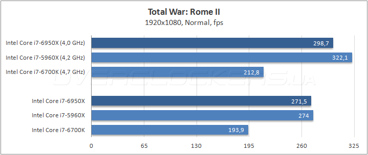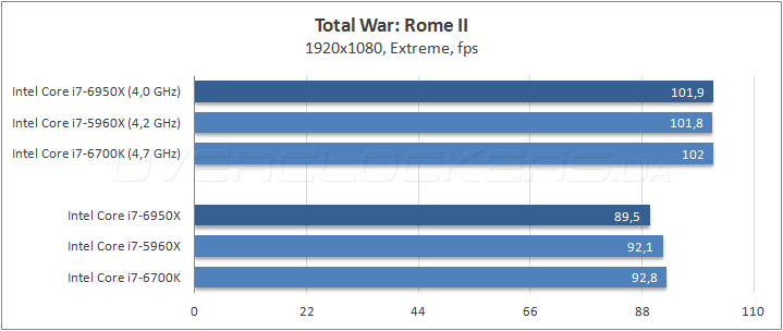 В Total War: Rome II новичок наоборот отстал от Core i7-5960X, а с переходом на более качественную графику — даже от Core i7-6700K.