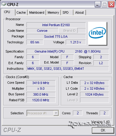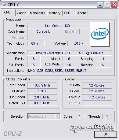 И, конечно же, мы провели проверку разгонного потенциала. Как это обычно бывает с архитектурой Core, все оказалось достаточно предсказуемым. Планка в 3,3 ГГц была взята без проблем, и мы зафиксировали следующие результаты: 3420 МГц для Pentium E2160 при напряжении 1,475 В (температура при этом доходила до 81°C на тестовом кулере) и 3357 МГц для Celeron 430 при 1,45 В (73°C).