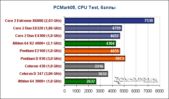 И первый тест - PCMark05, в котором процессоры с архитектурой NetBurst всегда обходили своего прямого конкурента в лице AMD Athlon/Sempron, - благосклонно отнесся к Pentium D 930 и Celeron D 347, которые оставили позади как конкурирующие решения, так и все Core 2 Duo, не говоря уже о Pentium E. Разницы же между кэшем Pentium E2160 и Core 2 Duo E4300 нет, а вот Core 2 Duo E6320, напротив, смог обогнать их на 3%. Процессору Celeron 430, увы, ничего не светит, хотя его "попугаи" и лучше результата Athlon 64 3000+, который как и двухъядерный коллега занимает последние строчки рейтинга в своем классе.