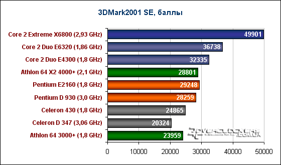 Ну вот, тест 3DMark2001 SE хоть и стар, но вполне справедливо распределил места. Теперь заметно влияние размера кэш-памяти в архитектуре Core, так же как и частоты FSB, хотя и не так сильно. Athlon 64 3000+ и Celeron 430 идут почти вровень с разницей в 900 баллов, и с этого теста начинается противостояние между Pentium E2160 и Athlon 64 X2 4000+.