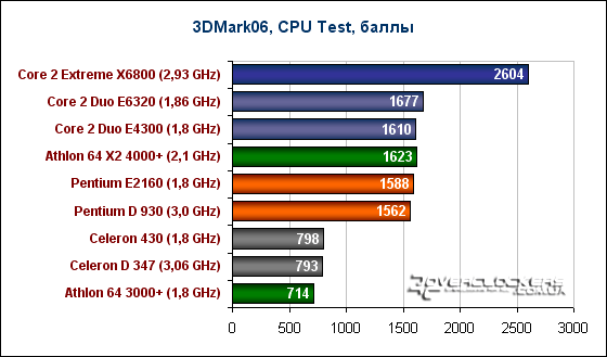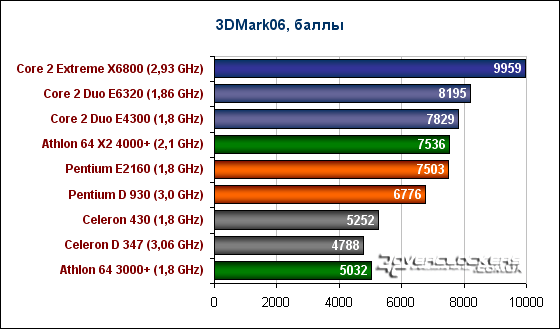 Последний тест от Futuremark распределяет места так же, как и предыдущий. Опять старые знакомые никак не поделят место под солнцем, и опять же дополнительный мегабайт кэша Core 2 Duo E4300 позволяет обойти Pentium E - в этот раз на 4%. Новый бюджетный процессор от Intel демонстрирует вполне неплохую производительность, обходя конкурента от AMD. Ну, а "кукурузные" мегагерцы Pentium D 930 уже не способны хоть как-то повлиять на производительность - вполне возможно, что его скоро догонят чуть более высокочастотные Celeron на архитектуре Core.