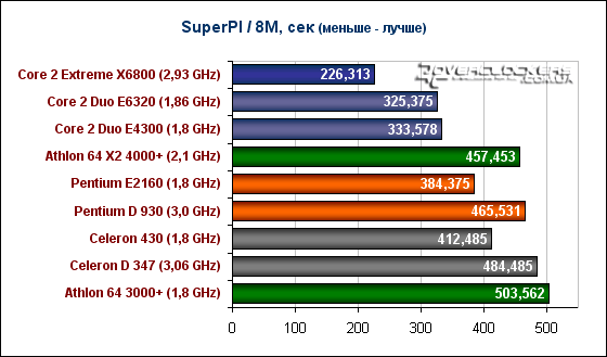 Расчет восьмимиллионного знака числа Пи тяжело дается процессорам архитектуры NetBurst и K8. Как пример: двухъядерный Athlon 64 X2 4000+ показал на 45 секунд худший результат по сравнению с Celeron 430, причем последний – одноядерный процессор! Отрыв Core 2 Duo E4300 от Pentium E2160 составил целых 15% - вот что значит увеличенный кэш, хотя разница между младшим представителем Core 2 Duo и Core 2 Duo E6320 практически незаметна.