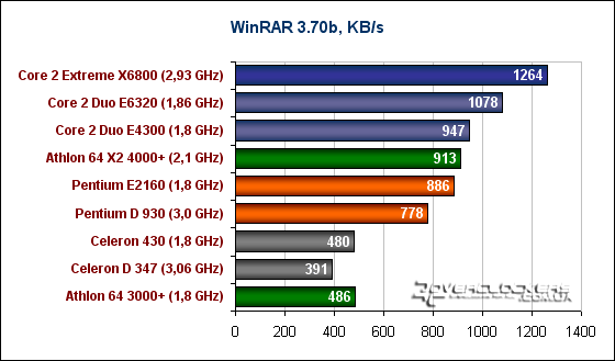 Картина результатов работы в архиваторе WinRAR аналогична 3DMark06, а демонстрируемые результаты процессоров K8 говорят о том, что архитектура уже старовата и необходимы кардинальные изменения. Ведь, работая с памятью на более низкой частоте, но и обладая встроенным контроллером памяти, оба Athlon 64 показывают отличную производительность, вот только в реальности им порой сложно противостоять архитектуре Core. Более высокая частота FSB процессора Core 2 Duo E6320 позволила обогнать всех своих "родственников", кроме, конечно же, экстремальной версии.