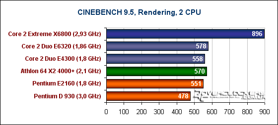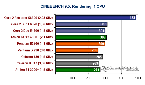 Приложение Cinebench 9.5 относится к тестам из профессиональной среды и позволяет произвести рендеринг сцены как с одним ядром, так и с двумя. Вот где действительно могут быть применимы во всей своей красе процессоры Athlon 64. И если разницы между мегабайтным и двухмегабайтным кэшем в Core нет, то 4 Мб и FSB1066 без проблем могут поднять производительность Core 2 Duo, причем двухъядерный Athlon 64 будет "дышать в затылок" именно такому процессору. Но и одноядерный Athlon 64 3000+ запросто обходит Pentium D 930 при рендеринге с одним ядром. Достаточно интересный тест, в котором даже оба Celeron оказываются быстрее Pentium D, а Celeron 430 приближается к Pentium E2160. Все это относилось к однопоточному рендерингу.