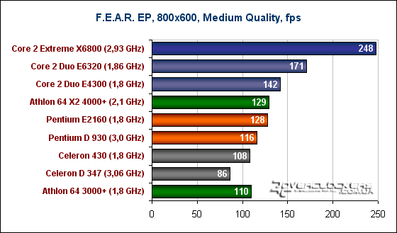 Как видно из теста F.E.A.R. Extraction Point, о поддержке двухъядерной конфигурации можно забыть - ее там просто нет, а если и есть, то не такая, как хотелось бы. Например, Celeron 430 вплотную приближается к Pentium D 930, так же как и Athlon 64 3000+. Второй мегабайт Core 2 Duo E4300 позволил прибавить 14 кадров по сравнению Pentium E2160, а 4-мегабайтный кэш и системная шина в 1066 МГц Core 2 Duo E6320 прибавили 29 кадров к предыдущему результату.