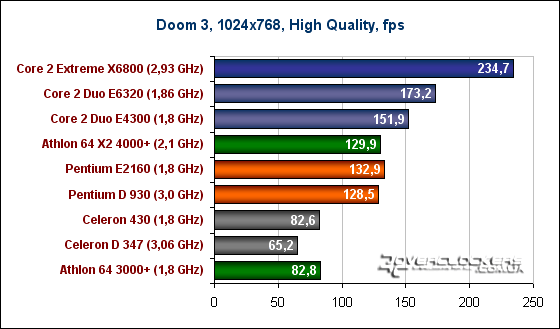 В игре Doom 3 одноядерные процессоры уже не в состоянии конкурировать со старшими собратьями, но соотношение сил в группе сохранилось. Celeron 347, как всегда, хуже на 20 кадров в секунду таких же бюджетных процессоров, как и он сам.