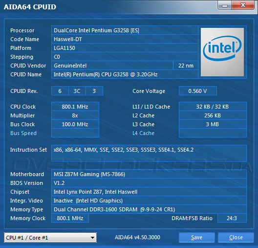 В нагрузке напряжение на процессоре составляет всего 1,064 В, тогда как в простое благодаря работе технологии Enhanced SpeedStep Vcore уменьшается до 0,56 В, а частота снижается до 800 МГц. В итоге, Pentium G3258 укладывается в тепловой пакет 53 Вт, так что в штатном режиме для его охлаждения хватит простейшего «боксового» кулера.