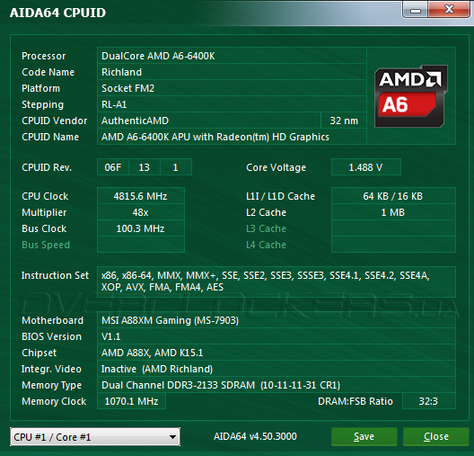 В плане оверклокинга A6-6400K показал себя довольно неплохо: после повышения Vcore до 1,5 В его тактовую частоту удалось увеличить до 4800 МГц, встроенный северный мост заработал на 2100 МГц, а для модулей ОЗУ был установлен режим 2133 МГц с таймингами 10-11-11-31-1Т.
