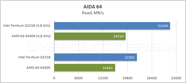 Тестирование традиционно открывает измерение пропускной способности подсистемы ОЗУ в программе AIDA64. Здесь Pentium G3258 показывает великолепные результаты — дает о себе знать отличный контроллер оперативной памяти, тогда как гибридному процессору AMD похвастаться абсолютно нечем.