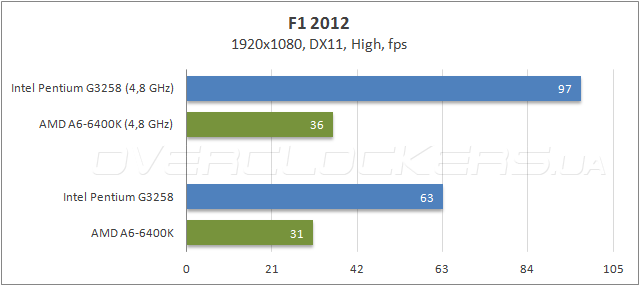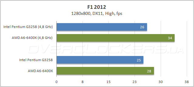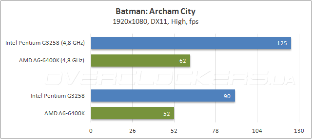 Результаты дают четко понять, что A6-6400K не место в игровом ПК с мощной дискретной видеокартой. В то же время, Pentium G3258 выглядит гораздо увереннее, а разгон улучшает его и без того неплохое быстродействие.