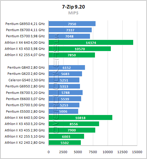 В тесте 7-Zip многоядерные процессоры AMD выглядят получше, и теперь уже Pentium G840 уступает Athlon II X3 450 и Athlon II X3 435 (с последним разница 28%). Но среди двухъядерных процессоров ему нет равных. Работающий на более высокой частоте Athlon II X2 255 уступает 2,5%, Pentium E6700 — 6%, Pentium E5500 —23%.