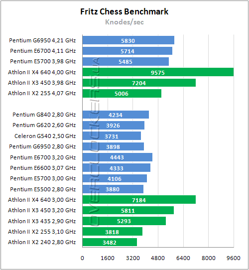 В тесте Fritz Chess Benchmark в лидерах процессоры с большим числом ядер. И Pentium G840 тут даже не оказывается лучшим среди двухъядерных собратьев, немного проигрывая старым Pentium E6700 и Pentium E6600. А вот Athlon II X2 255, несмотря на дополнительные 300 МГц, все равно слабее на 11%. Равный по частоте Athlon II X2 240 хуже Pentium G840 на 22%.