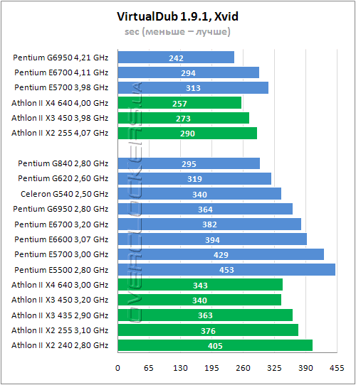 С конвертацией видео в VirtualDub быстрее всех справился Pentium G840. Стоит отметить, что в стане процессоров AMD заметно лишь небольшое преимущество от третьего и четвертого ядра, поэтому в номинале никто из Athlon II не смог составить конкуренцию Sandy Bridge. При разгоне все участники AMD оказываются чуть лучше, но незначительно. Особенно скромный выигрыш в 5 секунд у работающего на частоте 4,07 ГГц Athlon II X2 255. А лучше всех при разгоне все равно оказывается двухъядерный Intel, но старого образца — Pentium G6950. В номинале он же проигрывает собрату 23%.