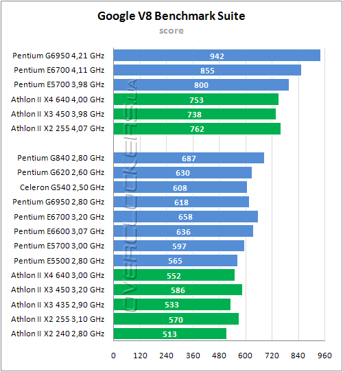 - Google V8 Benchmark Suite — специализированный тест, который базируется на движке JavaScript V8. Результат сильно зависит от браузера. На всех тестовых конфигурациях мы использовали Firefox 3.6.2, связано с тем, что первые процессоры были протестированы довольно давно.
