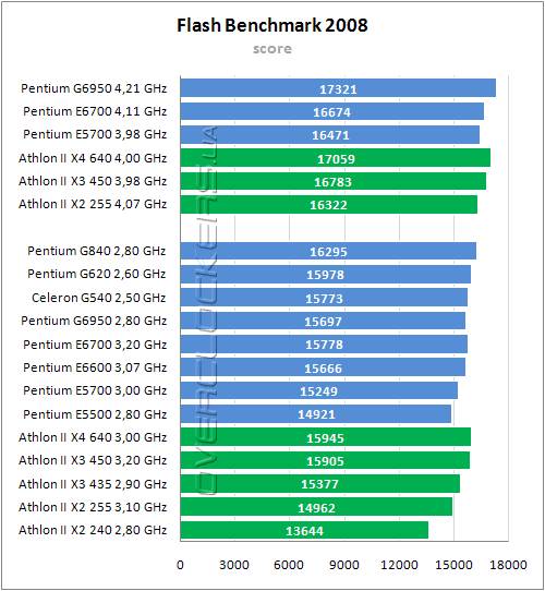 - Flash Benchmark’08 — специальный тест, сделанный во Flash. Запускался под Firefox 3.6.2 с установленным Adobe Flash Player 10. Тест включает четыре анимированные сценки. Первые две используют минимальную детализацию, последние — выполнены с большим числом деталей и с использованием сглаживания. При качестве Ultra на бюджетных процессорах даже было 10—15 fps, что совсем мало. Но итоговые результаты отличаются немного. Связано это с ограничением в 60 fps, а в такой ситуации результаты всех процессоров в первых двух сценах идентичны и вся разница в итоговых баллах определяется последними сценами, особенно на максимальном Ultra-качестве.
