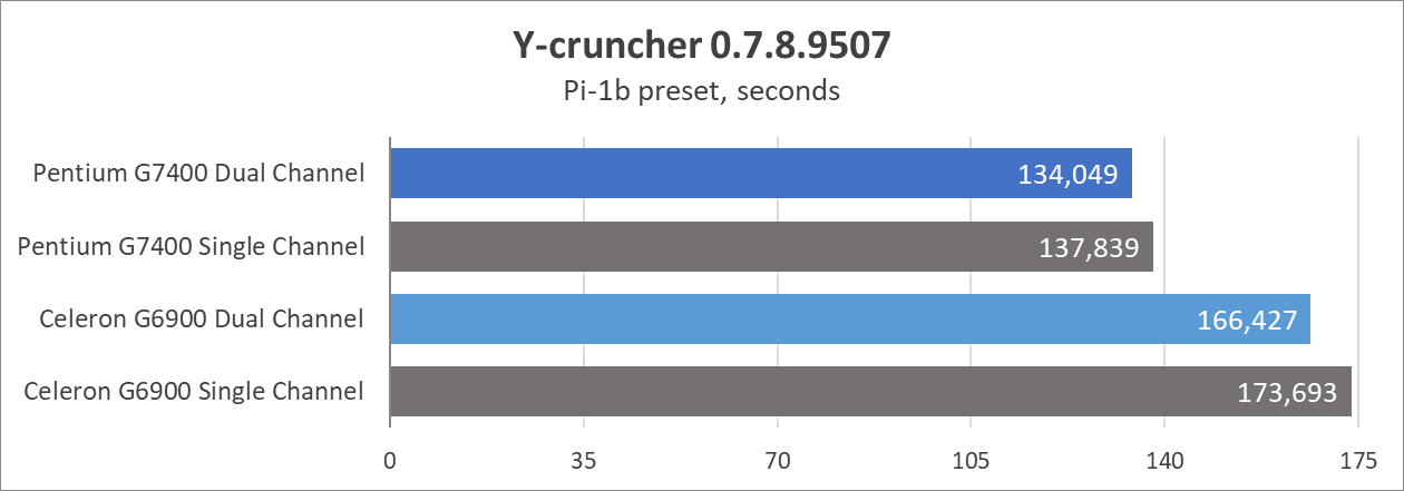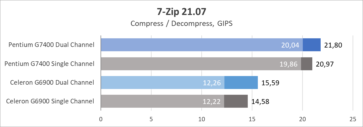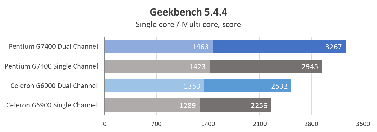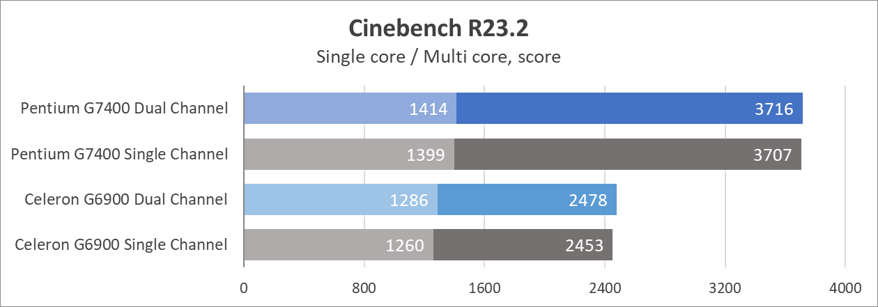 Один канал памяти в среднем уменьшает производительность на 5%. Примерно тот же уровень, что и у Celeron G6900 (6%). Все еще не критично, если необходимо сэкономить, или собраться на вырост.