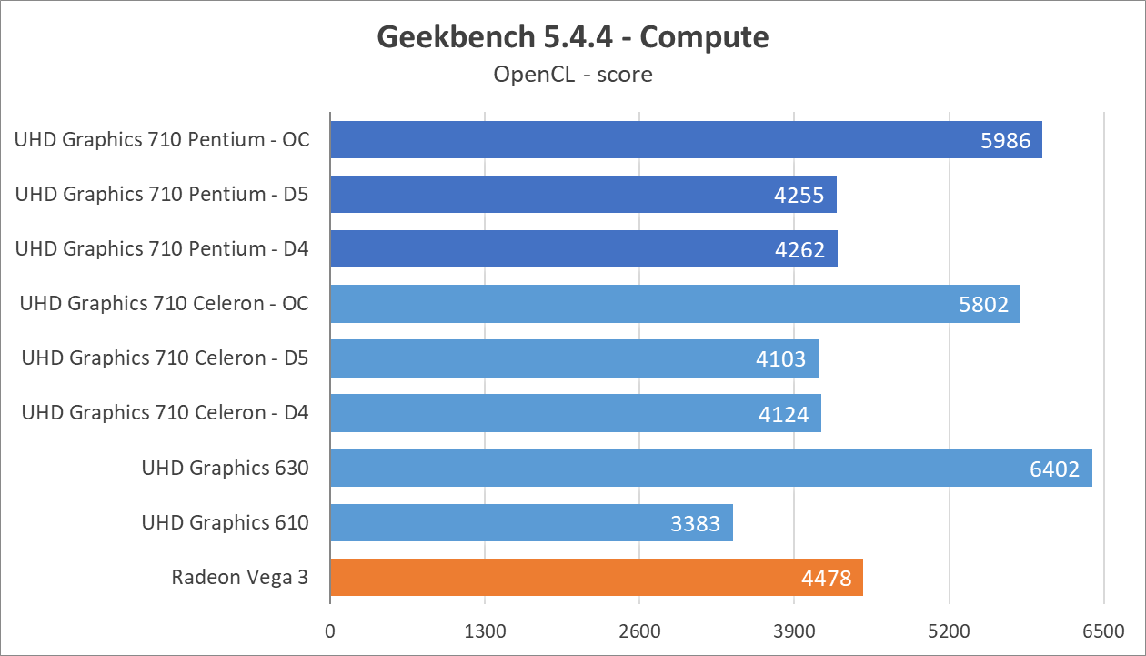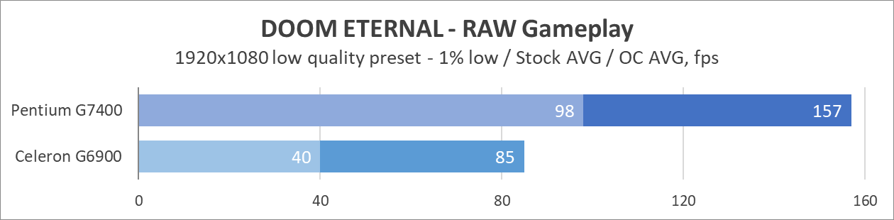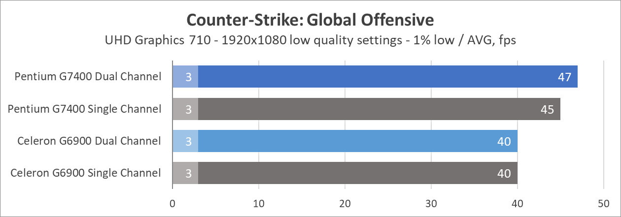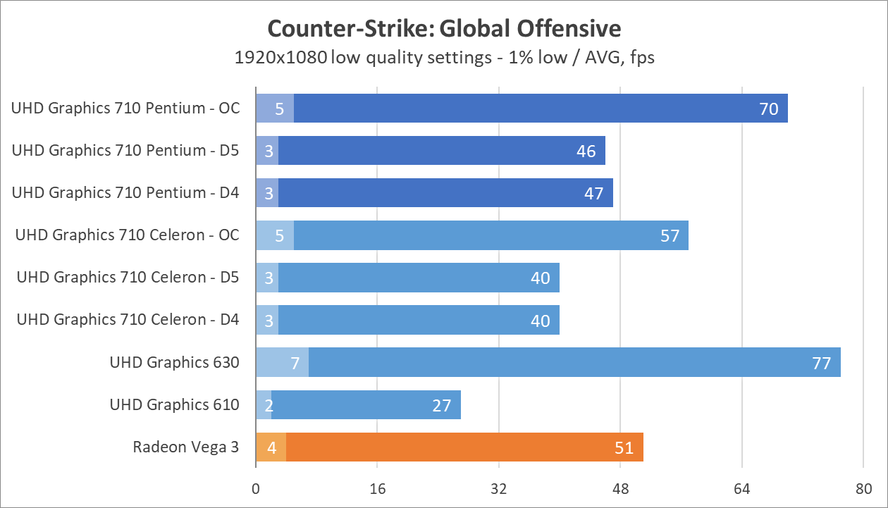 Из-за заметной процессорозависимости современных игр может создаться впечатление, что UHD Graphics 710 внутри Pentium G7400 уже выглядит не так уж и плохо на фоне UHD Graphics 710 внутри Celeron G6900.