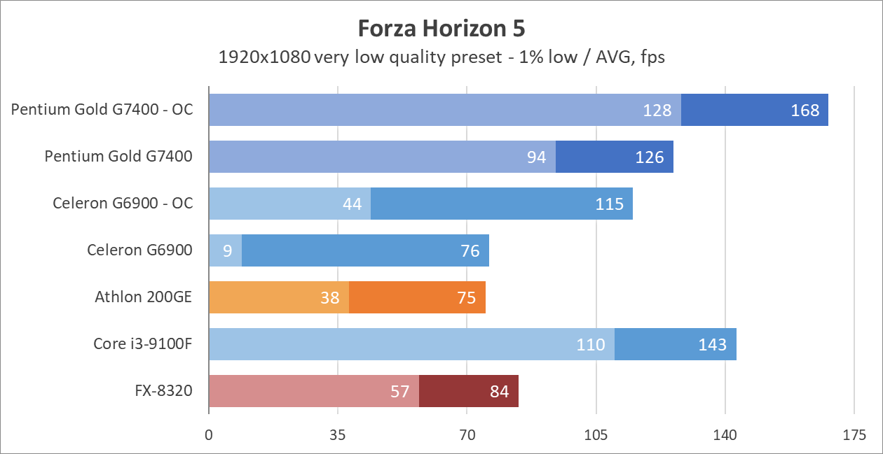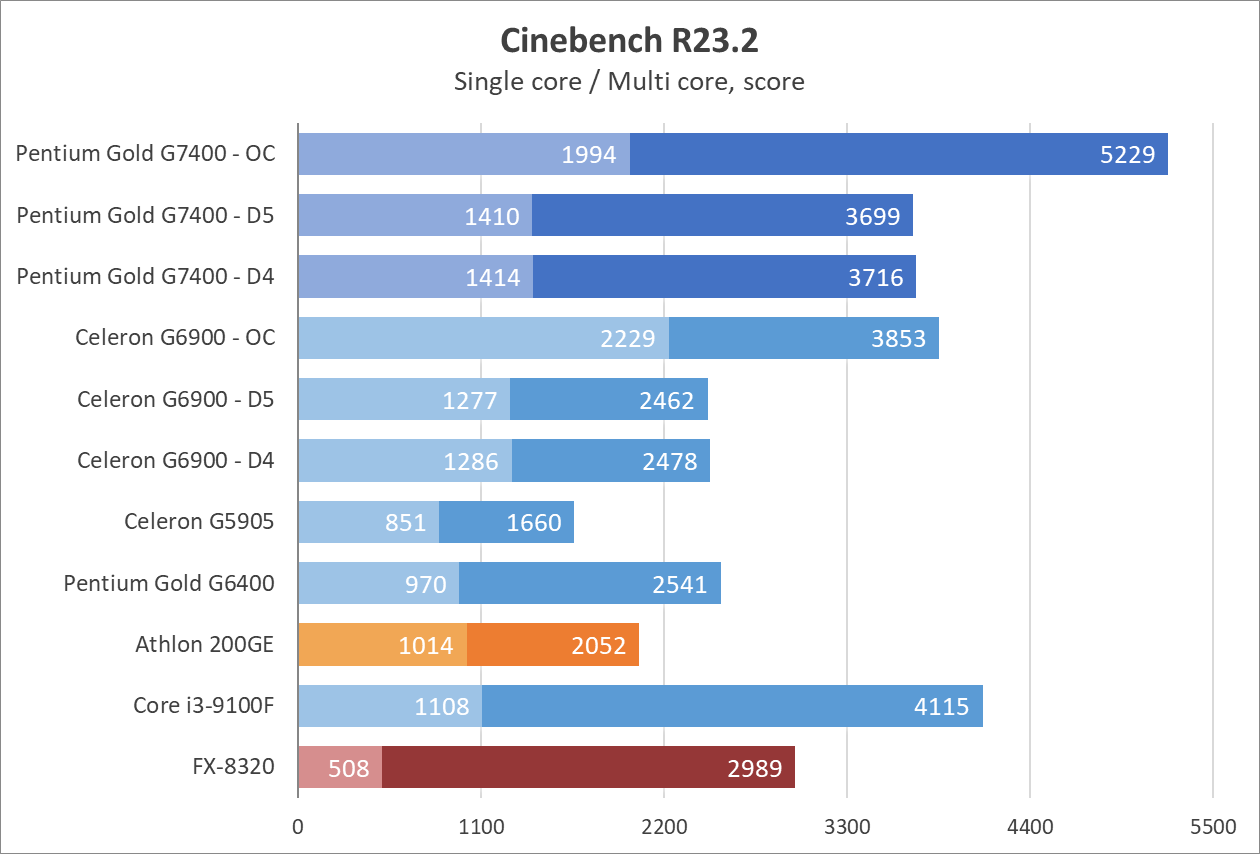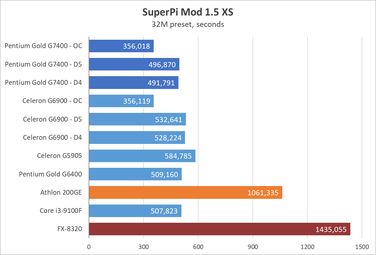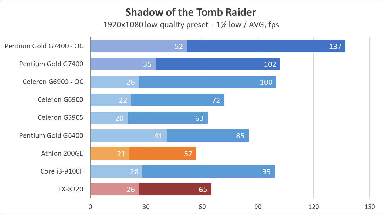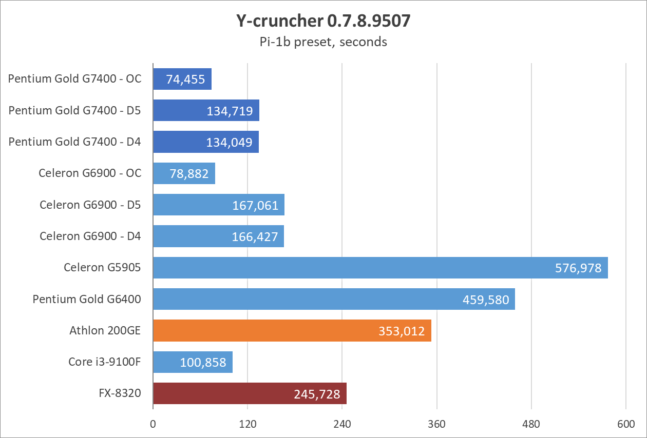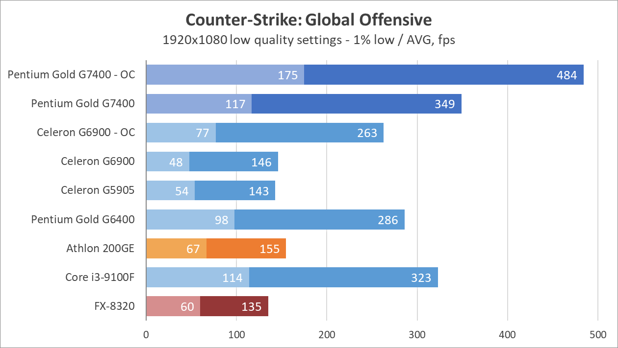 Цифры выглядят недурно, как для 2-ядерного процессора, и даже нет артефактов звука или недогрузки игровых миров как в случае с Celeron G6900. Процессор способен показывать зубы полноценным 4-ядерникам, вроде Core i3-9100, а у прошлых поколений просто не остается шансов. 8-ядерный (4-модульный, если изволите) FX-8320 выглядит как какая-то шутка на фоне Pentium Gold G7400 даже в заводском режиме, хотя при этом FX местами может опередить всех испытуемых в бенчмарках.