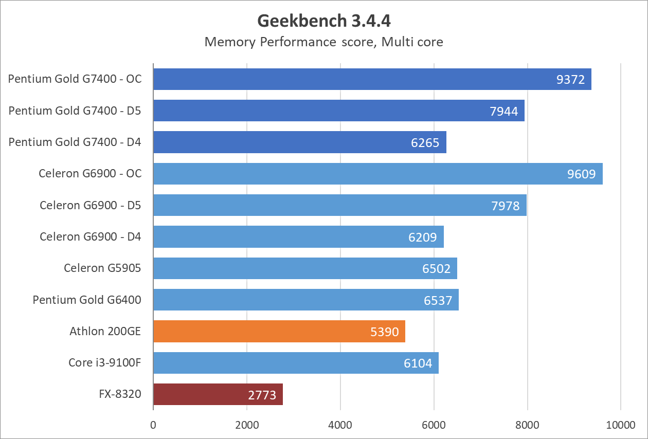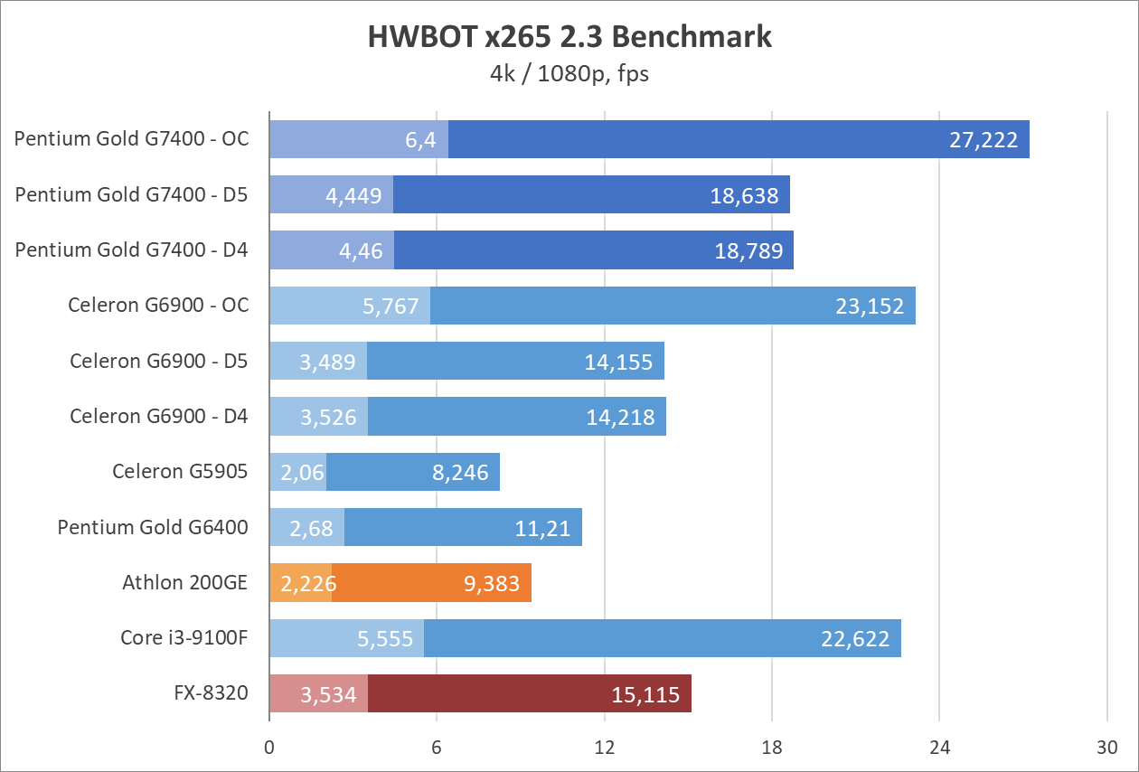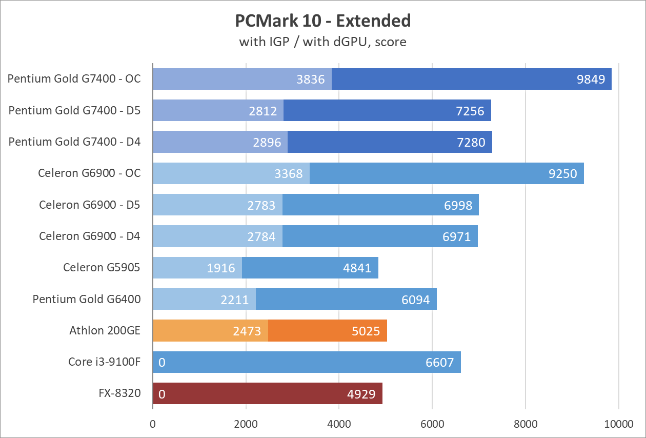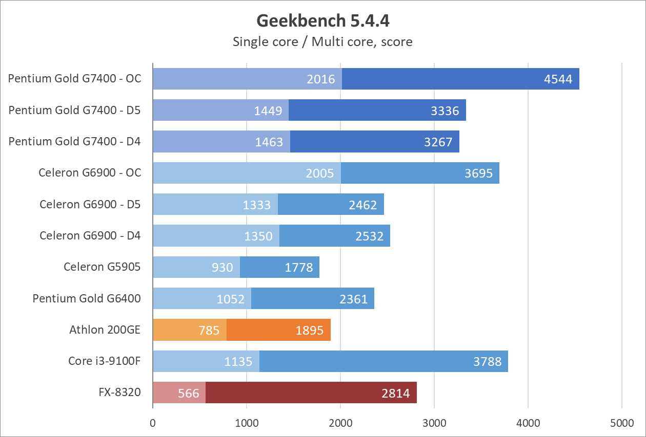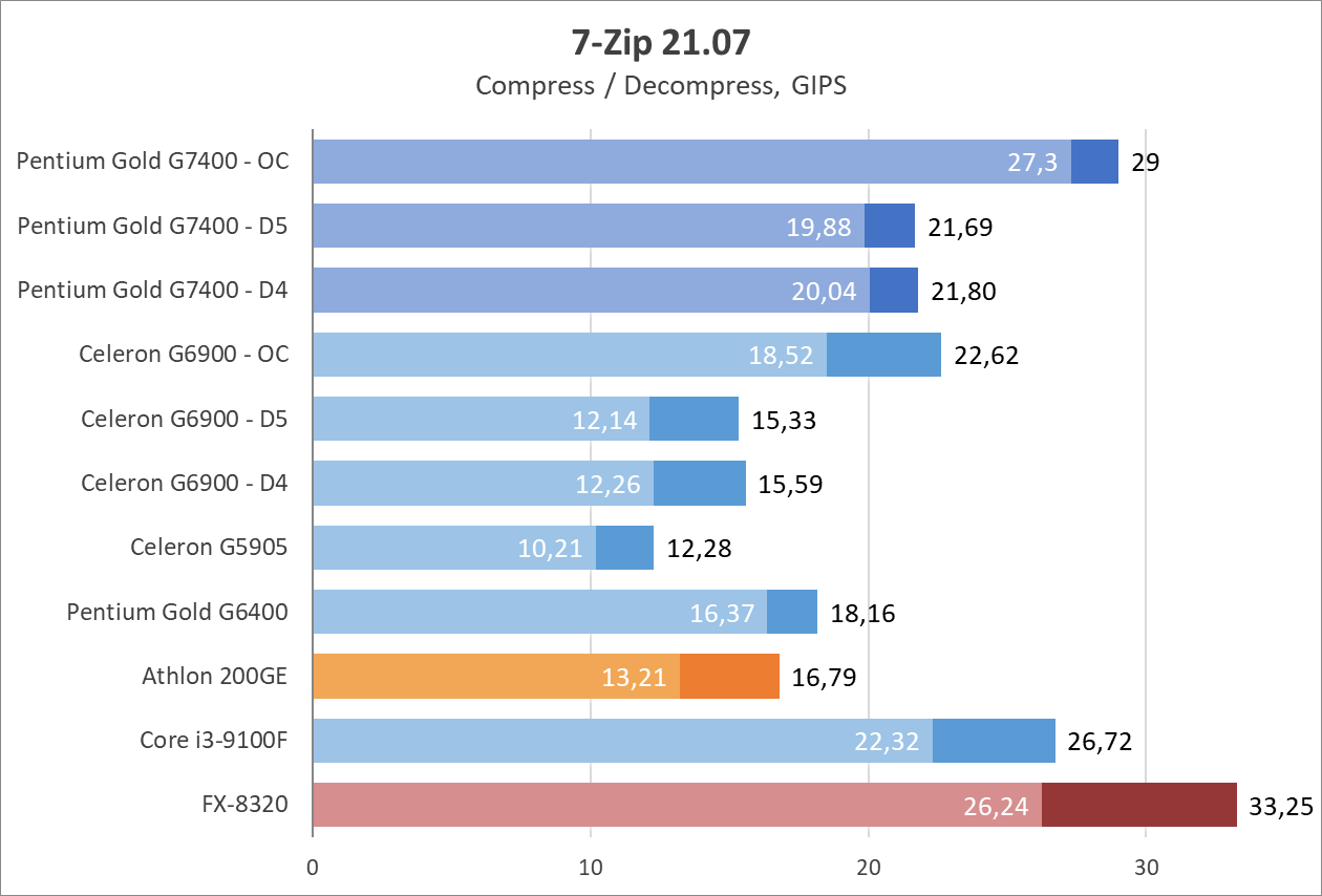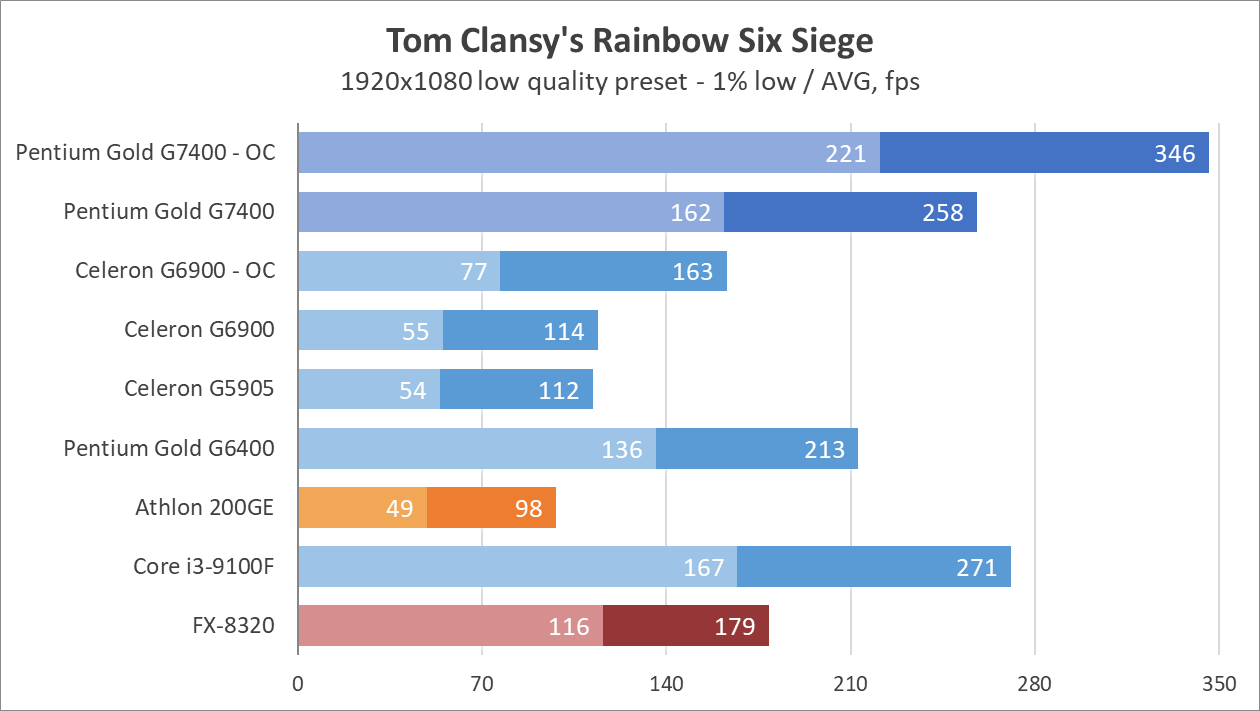 Цифры выглядят недурно, как для 2-ядерного процессора, и даже нет артефактов звука или недогрузки игровых миров как в случае с Celeron G6900. Процессор способен показывать зубы полноценным 4-ядерникам, вроде Core i3-9100, а у прошлых поколений просто не остается шансов. 8-ядерный (4-модульный, если изволите) FX-8320 выглядит как какая-то шутка на фоне Pentium Gold G7400 даже в заводском режиме, хотя при этом FX местами может опередить всех испытуемых в бенчмарках.