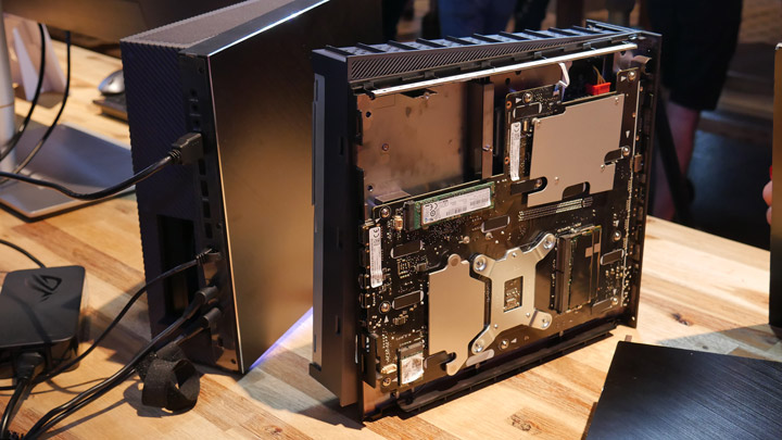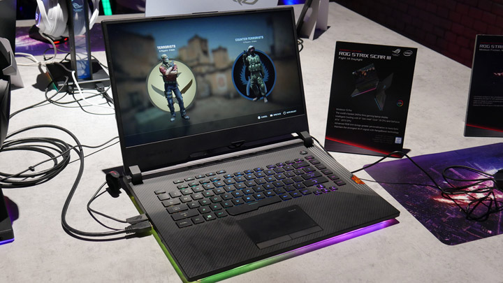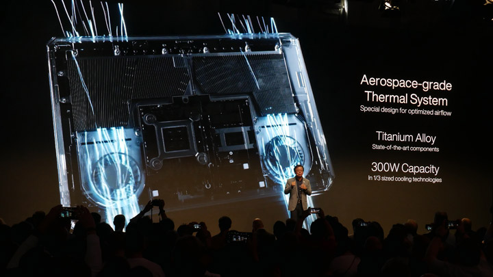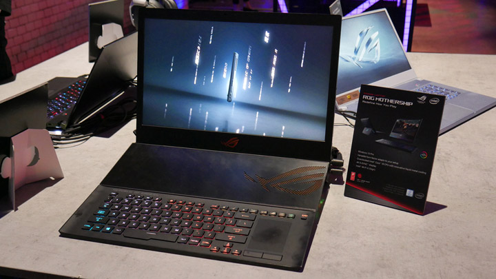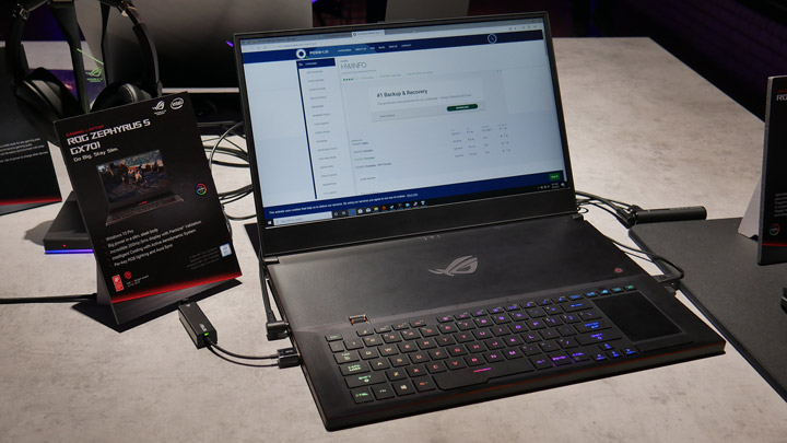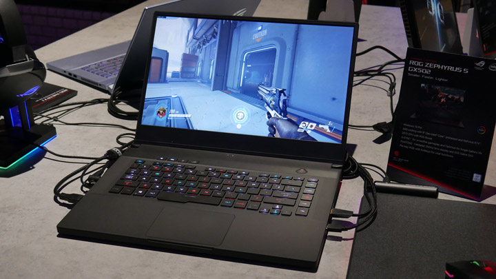 Основной акцент среди игровых новинок был сделан на 17″ ROG Zephyrus S GX701. Первый в мире (по утверждению компании) игровой ноутбук с экраном, имеющим частоту обновления в 300 Гц при 3 мс времени отклика матрицы. Дисплей откалиброван с завода и соответствует сертификации PANTONE при 100% охвате цветового пространства sRGB. Коротко по остальным характеристикам — процессор Intel Core i7 9-го поколения, видеокарта Nvidia GeForce RTX 2080 с максимальной тактовой частотой 1230 МГц (при энергопотреблении 100 Вт в Turbo-режиме). Система GPU Switch позволяет легко переключаться между двумя режимами работы графической подсистемы: на основе встроенного графического ядра (режим Optimus) для работы и увеличения автономности, и на основе дискретной видеокарты (режим G-SYNC™) для запуска современных игр. Для охлаждения используется прямоточная система ROG Active Aerodynamic System.